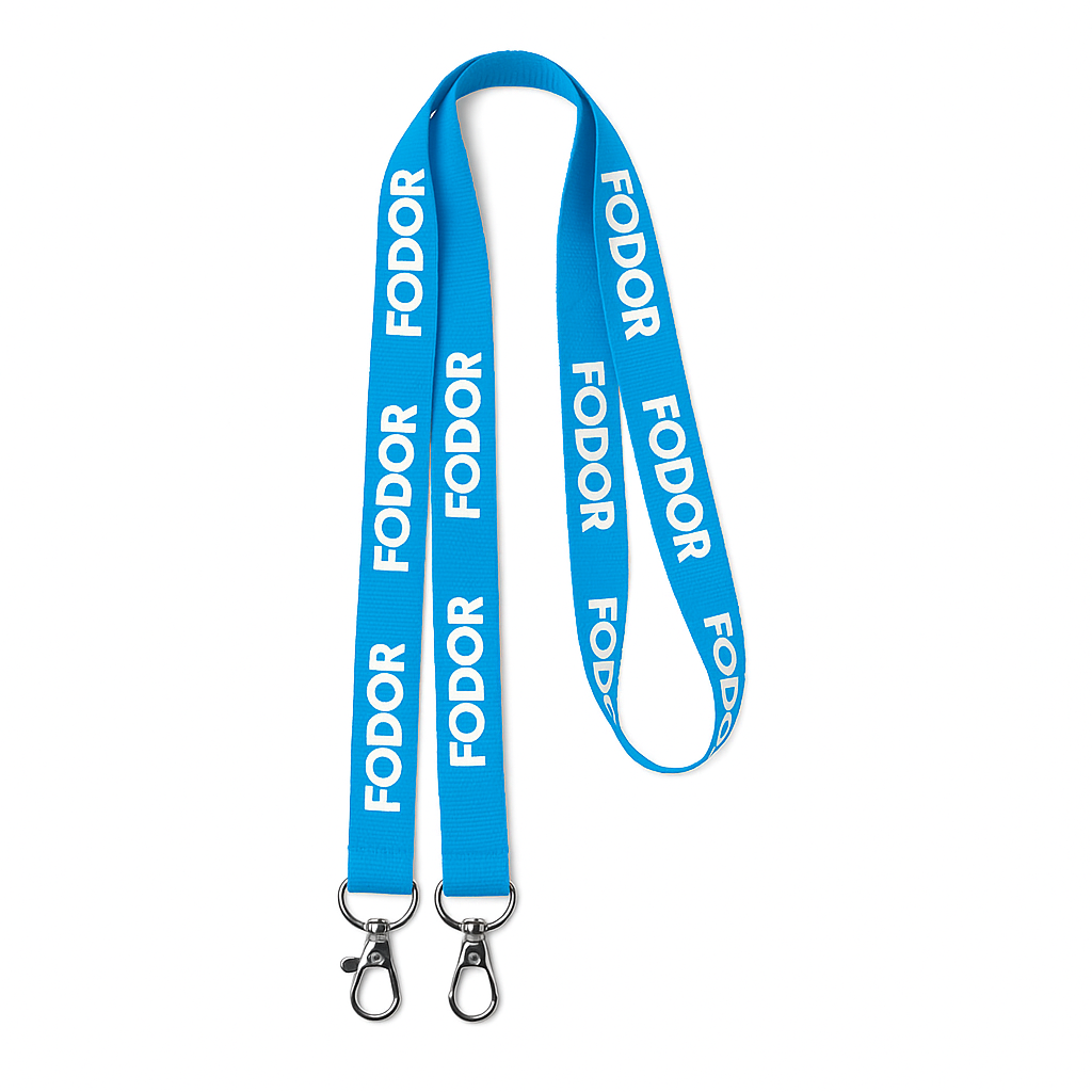 Este modelo de lanyard incorpora dos mosquetones metálicos, uno en cada extremo, lo que lo hace ideal para credenciales amplias, portamascarillas, cartillas informativas o soportes en formato horizontal.
